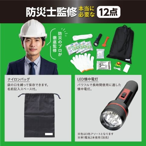 ナイロンバッグ×1、懐中電灯×1、モバイルバッテリー3000mAh×1、アルミシート×1、ホイッスル(2色アソート)×1