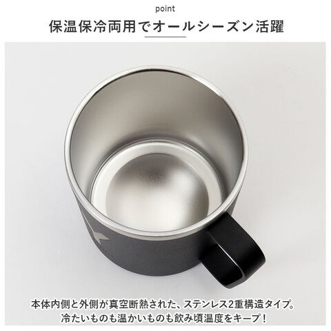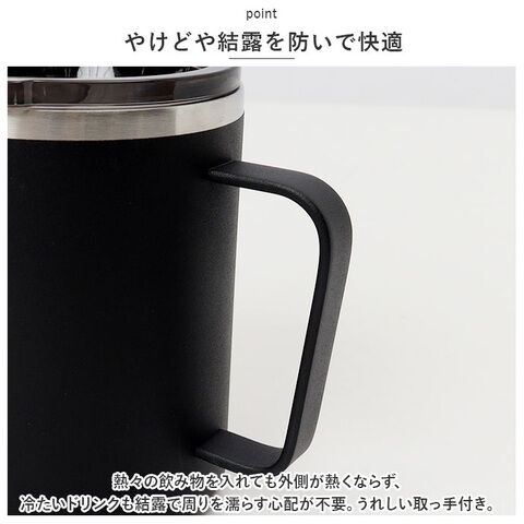 熱々の飲み物を入れても外側が熱くならず、冷たいドリンクも結露で周りを濡らす心配が不要。うれしい取っ手付き。