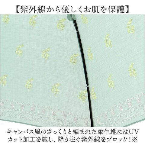 リネン調の素朴な風合いの傘生地に小花の刺繍を散りばめたパラソルで、夏色にパッと衣替え!