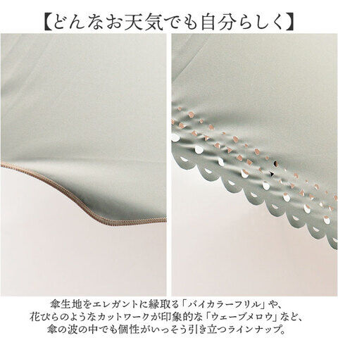 傘生地をエレガントに縁取る「バイカラーフリル」や、花びらのようなカットワークが印象的な「ウェーブメロウ」など、傘の波の中でも個性がいっそう引き立つラインナップ。