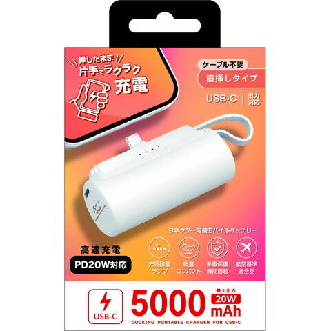 エアージェイ 直挿しタイプ PD20W対応 Type-C 横型モバイルバッテリー+Type-C1ポート 5000mAh(ホワイト) air-J MB-T5000PDWH 【返品種別A】