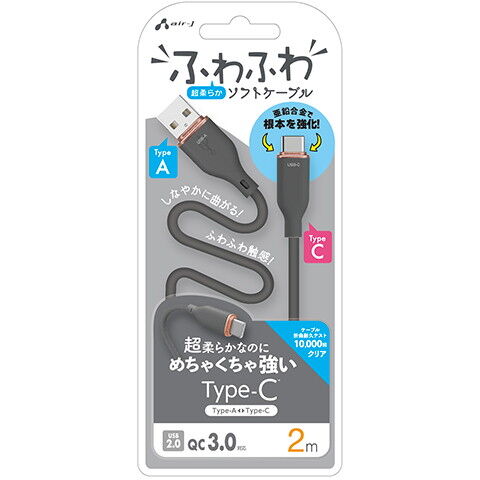 エアージェイ Type-C 強化コネクターふわふわケーブル 2m(グレー) air-J UCJ-AW2MGY 【返品種別A】