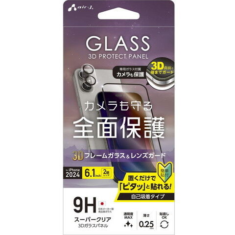 エアージェイ iPhone 16用 3D全面保護ガラス光沢&カメラレンズ2眼セット air-J VGPR-P24-SET 【返品種別A】
