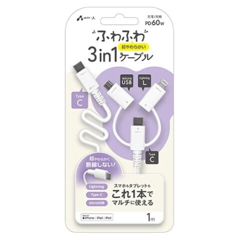 エアージェイ MFiライトニング/Micro USB変換付 Type-C to Type-C ふわふわ3in1ケーブル(1m・ホワイト) air-J CKJ-LMC1MWH 【返品種別A】