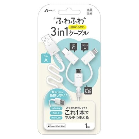 エアージェイ MFiライトニング/Type-C変換付 Type-A to Micro USB ふわふわ3in1ケーブル(1m・ホワイト) air-J UKJ-ALMC1MWH 【返品種別A】