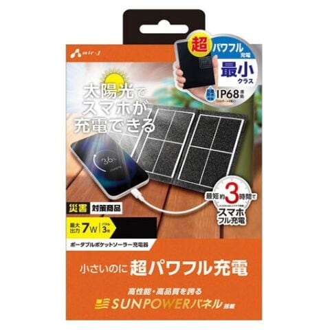 エアージェイ ポータブルポケットソーラー充電器 最大出力7W(ブラック) air-J AJ-PSOLAR7W 【返品種別A】