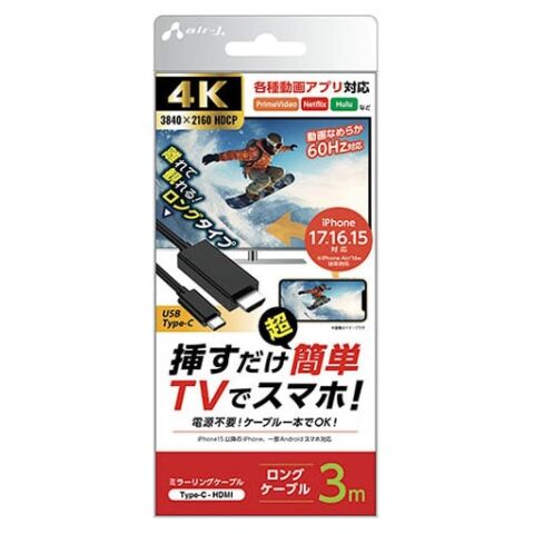 エアージェイ HDMI to Type-C ミラーリングケーブル 60Hz(3m・ブラック) air-J AHD-C3M 【返品種別A】