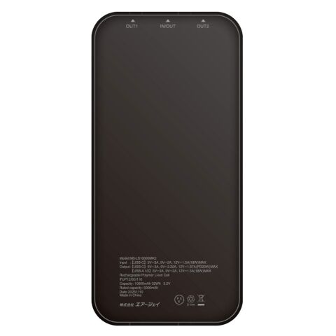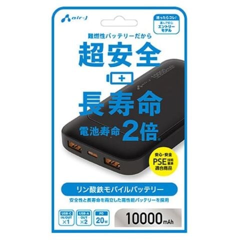 エアージェイ PD20W対応 Type-C 1ポート/USB 2ポート リン酸鉄安心モバイルバッテリー 10000mAh(ブラック) air-J MB-LS10000MK2BK 【返品種別A】