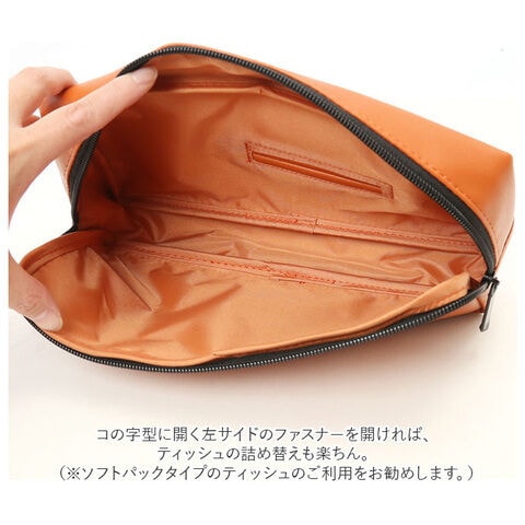 コの字型に開く左サイドのファスナーを開ければ、ティッシュの詰め替えも楽ちん。