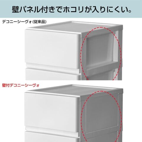 本体側面、背面にバネルが付いているので、引出し内にホコリが入れにくい設計。