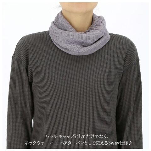 ワッチキャップとしてだけでなく、ネックウォーマー、ヘアターバンとして使える3way仕様! 鼻まで覆うと、フェイスマスクとしても使える。