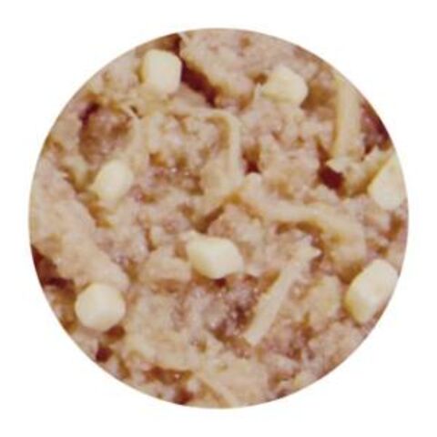 ■原材料:鶏肉、鶏ささみ、鶏肝、プロセスチーズ、鶏ガラスープ、鶏脂、魚介エキス、イソマルトオリゴ糖、寒天、たんぱく加水分解物、宗田鰹オイル、酸化防止剤(ビタミンE)