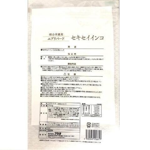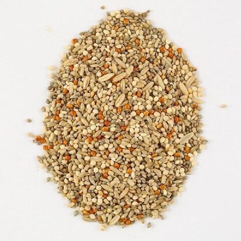 ペレット(米、米糠、粟、炭酸カルシウム、果糖、天日原塩、乳酸菌、トルラ酵母、糖蜜、ケイ酸アルミナ、アルファミール、麦芽発酵エキス、ビタミン類(A、D3、E、B1、B2、B6、B12、D-パントテン酸カルシウム、ニコチン酸)、ミネラル類(硫酸マンガン、硫酸亜鉛、硫酸銅、硫酸マグネシウム、硫酸鉄、塩化コバルト)、アミノ酸類(塩化コリン、メナジオンK3)、香料)、アワ、ヒエ、キビ、カナリアシード、オーツ