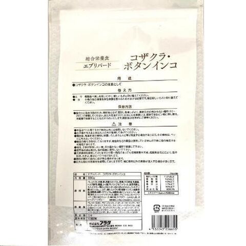 ペレット(米、米糠、粟、炭酸カルシウム、果糖、天日原塩、乳酸菌、トルラ酵母、糖蜜、ケイ酸アルミナ、アルファミール、麦芽発酵エキス、ビタミン類(A、D3、E、B1、B2、B6、B12、D-パントテン酸カルシウム、ニコチン酸)、ミネラル類(硫酸マンガン、硫酸亜鉛、硫酸銅、硫酸マグネシウム、硫酸鉄、塩化コバルト)、アミノ酸類(塩化コリン、メナジオンK3)、香料)、キビ、マイロ、カナリアシード、小粒ひまわり、メーズ、麻の実、サフラワー、ムキえん麦、ボレー、グリーンボレー