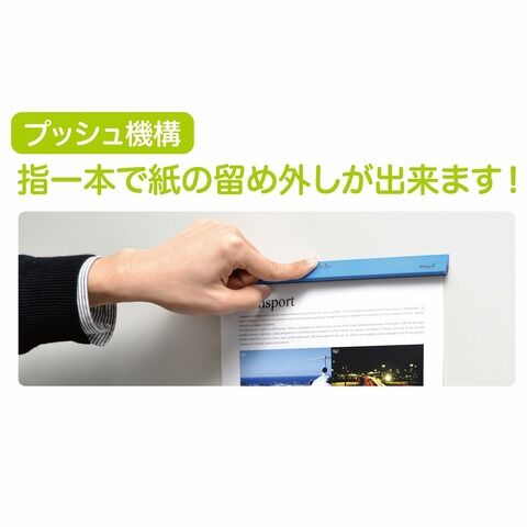 ◆プラスチック製の定番マグネットバー。紙の留め外しが簡単にできるプッシュ機構付き。
