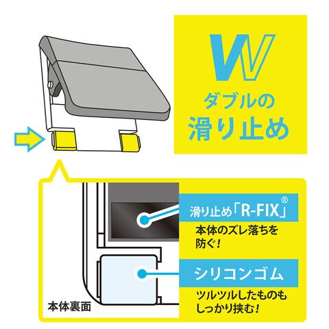 ◆本体裏面に独自開発の滑り止めR-FIXを使用。本体のズレ落ちを防ぐ。