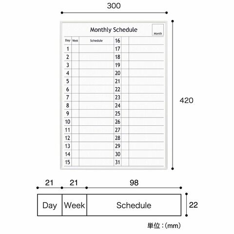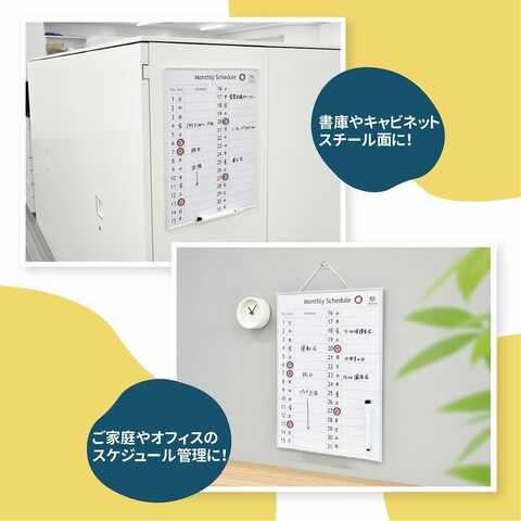 ◆裏面マグネット付きのホワイトボードシリーズ。スチール壁面、冷蔵庫、黒板などに貼って使えます。A3サイズの月間予定表です。