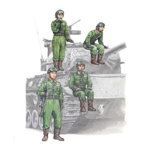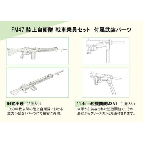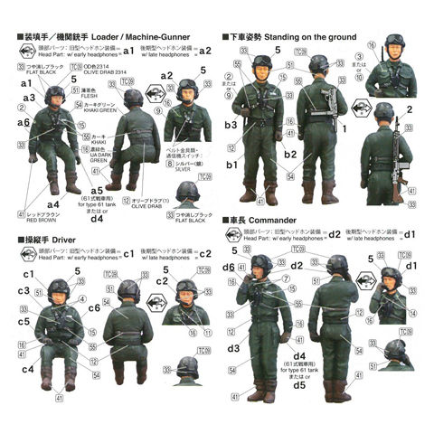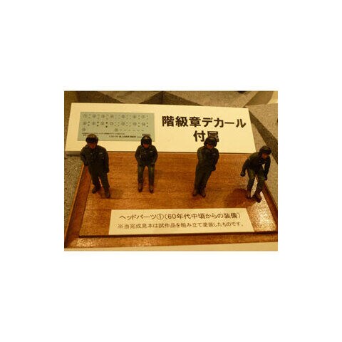 完全新金型 自衛隊員フィギュア4体セット。(乗車姿勢3体+下車姿勢1体の合計4体) 服装は通称OD作業服/迷彩服1型の形状を再現。 使用年代が異なる装備のヘッドパーツが2種類付属。 1965年~90年代の各戦車/装甲車/自走砲に使用可能。(61式戦車/60式装甲車の車長・操縦手用台座付属) 64式小銃・11.4mm短機関銃M3A1(グリースガン)付属。 階級章デカール付属 パーツ点数 31点+デカール