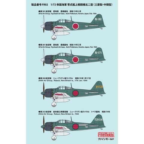 マーキングは愛知県豊橋にて錬成ののち蘭印(オランダ領東インド=インドネシア群島)の防空戦力として奮闘した海軍第381航空隊所属機より2機、ラバウルに展開した204空所属機を1機、同じくラバウルの253空に所属し日本のトップエースともいわれる岩本徹三の乗機、以上4機の水転写デカールが付属します。