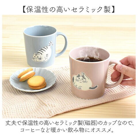 淡いくすみカラーの釉薬に、手書き風の猫を優しいタッチで描きだした美濃焼のシンプルマグ。