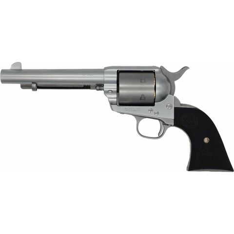 実銃においても、コルトSAAの3rdジェネレーションではノンフルートシリンダーが製作された例が存在しますが、ステンレスカラーとの組み合わせとなると、現代的に再解釈されたクラシック・シングルアクションリボルバー、Sturm Ruger社のVaqueroを想起させる佇まいです。