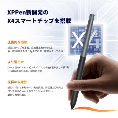 付属のX4スマートチップスタイラスペンは16384段階で筆圧を感知し、軽いタッチで優れたレスポンスを実現します。