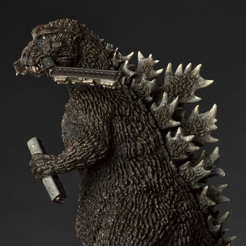 台座となる足元の崩壊した日劇ビルや国鉄高架線と、電車を咥えわしづかみにするポーズが臨場感を引き立てます。