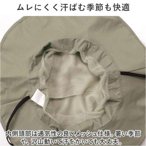 UVカット率95%以上、UPF50+の360度つば付きハット。