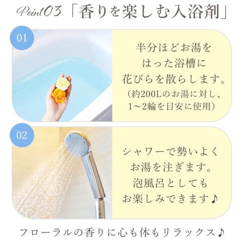 半分ほどお湯をはった浴槽に花びらを散らし、シャワーで勢いよくお湯を注ぐだけ。優しいフローラルの香りと泡で、心も体もリラックス♪(※約200Lのお湯に対し、1~2輪を目安にご使用ください。)