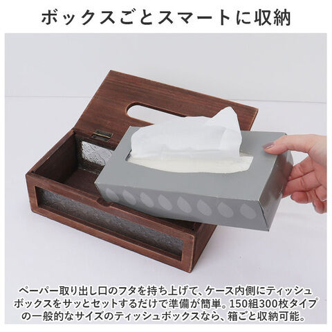ぺーパー取り出し口のフタを持ち上げて、ケース内側にティッシュボックスをサッとセットするだけで準備が簡単。150組300枚タイプの一般的なサイズのティッシュボックスなら、箱ごと収納可能(※1)。