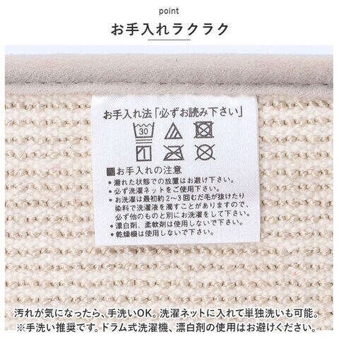 汚れが気になったら、手洗いOK。洗濯ネットに入れて単独洗いも可能。(※手洗い推奨です。ドラム式洗濯機、漂白剤の使用はお避けください。)
