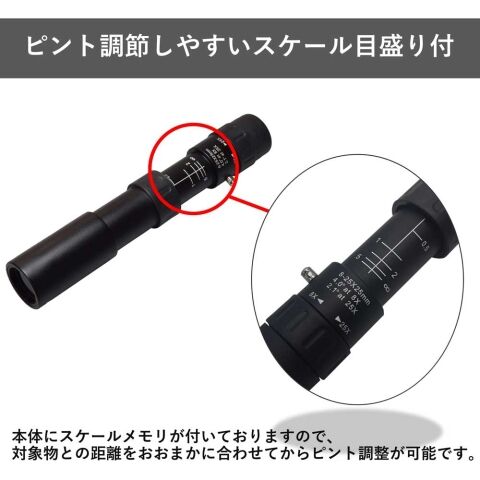 ◆スケール採用。対象物までのおおよその距離をスケールで合わせた後、フォーカスノブで 細かくピント調整ができるため、素早く鮮明な視界が得られます。