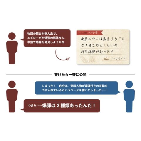 それぞれが異なる順番でページを書き加えていくため、突拍子もない展開を書いてしまっても、後のページで辻褄を合わせることができます。
