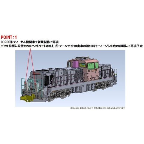 前面手すり部に設置されたヘッドライトを再現 ヘッドライトは常点灯基板装備 ヘッドライトは電球色LEDによる点灯 ホイッスル・列車無線アンテナは別パーツで再現 Hゴムは黒色で再現 ナンバープレートは別パーツ付属「DD200-9・12・16・21」 フライホイール付動力、銀色車輪採用 ダミーカプラー・自連形TNカプラー付属