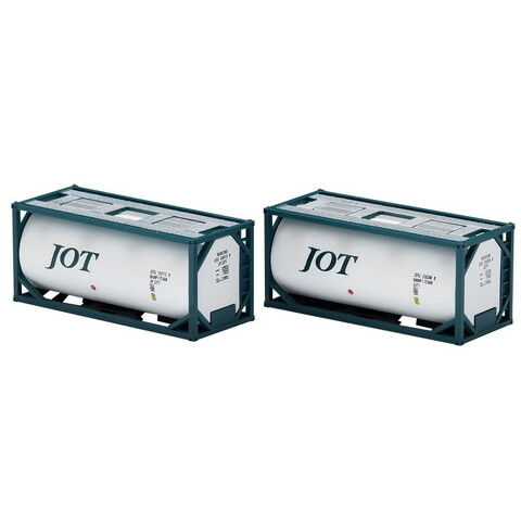 ISO20ftタンクコンテナのうちフレームタイプを再現 タンク本体には「JOT」ロゴや各種標記を印刷済み フレームはタンク容量が21000Lのタイプであるグリーンで再現 番号印刷済み(JOTU 330172・JOTU 330206) 再生産のコキ200を含む各種コンテナ貨車に搭載する際に必要な床板は取り付け済み 2個入り