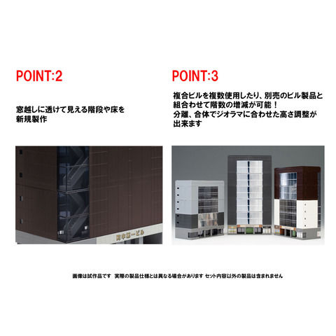 5階建てのビルで1階部と2~3階部、4~5階部、屋上部の4パーツの組立構造 2~5階の大きい窓がミラー仕様 別売の(4216)複合ビル(7階建)と組合わせて11階建ビルや複数組み合わせてさらに階数の多いビルにすることが可能 別売の(4218)総合ビル、(4220中型ビル、(4245)大型ビルと共通構造で組替可能