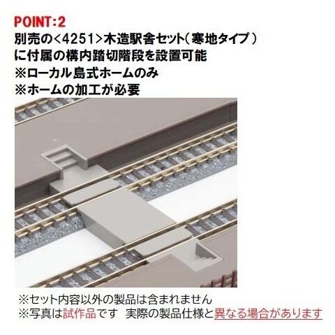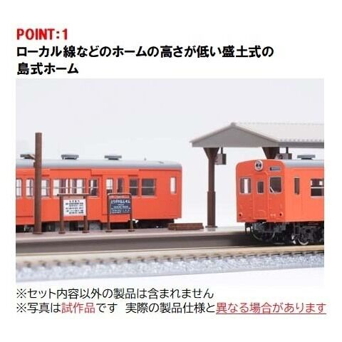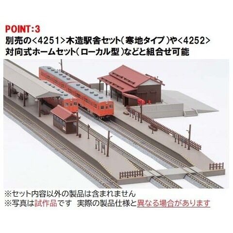 ローカル線などのホームの高さが低い島式ホーム 20m級車両が5両まで停車可能な長さ ローカル島式端ホーム(スロープ)×1、ローカル島式ホーム(待合室)×1、ローカル島式ホーム(屋根付)×2、ローカル島式ホーム×2 待合室の屋根は瓦屋根かトタン屋根を選択可能 ローカル島式ホーム(屋根付)には地下通路階段を設置可能(ホームと地下通路階段の加工が必要) 各ホームに駅名標や花壇などを取り付け可能(ホームに穴あけ加工が必要) 別売りの(4258)島式ホーム(ローカル型)屋根付き延長部、(4259)島式ホーム(ローカル型)延長部と組合せてホーム長を延長可能 別売の(4251)木造駅舎セット(寒地タイプ)に付属の構内踏切階段をローカル島式ホームのホーム中央に設置可能(ホームの加工が必要) 駅舎は別売の(4202)木造駅舎セット(グリーン)や<4251>木造駅舎セット(寒地タイプ)などを使用
