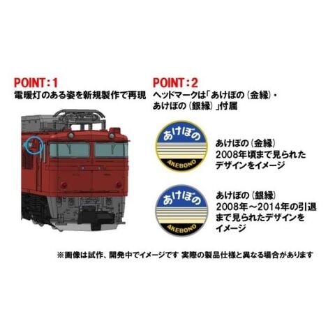 青森車両センターに所属したEF81形のうち、双頭形連結器の取り付け 改造をされた車両を再現、長岡車両センター所属の車両も再現可能 電暖灯のある姿を新規製作で再現 運転台シースルー表現 Hゴムは黒色で再現 前面手すり(縦)は別パーツ付属 解放テコは別パーツを装着済み ナンバープレートは別パーツ付属「EF81-134・136・139・141」 ヘッドマークは「あけぼの(金縁)・あけぼの(銀縁)」付属 ヘッドライトは常点灯基板装備、ON-OFFスイッチ付 ヘッドライトは電球色LEDによる点灯 信号炎管、ホイッスルは別パーツ付属 フライホイール付動力、黒色台車枠、黒色車輪採用 プレート輪心付車輪採用 双頭形TNカプラー付属 M-13モーター採用