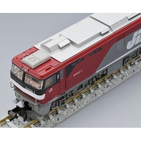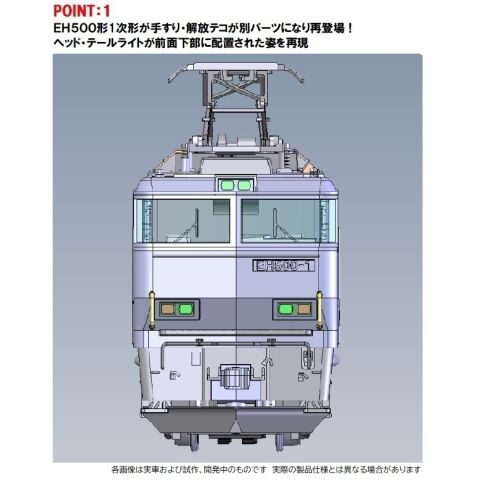 EH500形1次形のJRFマークのある姿を再現 2エンド側屋根上のベンチレーターは強制通風式の大型へと交換された姿を再現 GPSアンテナを撤去した姿を再現 ヘッドライトは常点灯基板装備 ヘッドライトは電球色LEDによる点灯 解放テコは別パーツ装着済み 前面手すり(縦)は別パーツ付属 JRFマーク、金太郎マーク、JR FREIGHTマークは印刷済み ナンバープレートは別パーツ付属「EH500-1・2」 全軸集電を採用 全軸駆動を採用 信号炎管、ホイッスル、無線アンテナは別パーツ付属 ダミーカプラー、自連形TNカプラー付属 フライホイール付動力、グレー台車枠、銀色車輪採用 M-13モーター採用