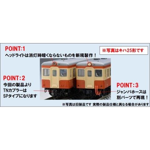 ハイグレード(HG)仕様 非点灯時に黒くならないヘッドライトプリズムを採用 ジャンパホースは別パーツにより立体的に再現可能 ヘッド・テールライトは常点灯基板装備、ON-OFFスイッチ付 ヘッドライトは電球色LED、テールライトは赤色LEDによる点灯 Hゴムはグレーで再現 シートは青色で再現 車番は選択式で転写シート付属 ヘッドライトは1灯式の姿を再現、付属パーツにより2灯式も再現可能 TNカプラー(SP)標準装備 従来型集電システム・黒色車輪採用 前面タイフォンパーツ付属 トイレを装備するキハ11形のうち運転台直後のベンチレーターが片面押込式のグループを再現