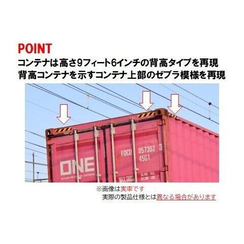 コンテナは40フィート海上コンテナを1個搭載 マゼンダをベースに「ONE」のロゴが入った海上コンテナを再現 コキ106形は前期型を再現 コキ106形の車番は印刷済み コキ106形は側面のJRFロゴ・突放禁止標記がなくなった姿を再現 搭載コンテナはロゴ・標記類を印刷済み 手すり・ブレーキハンドルは取付済み 銀色車輪採用