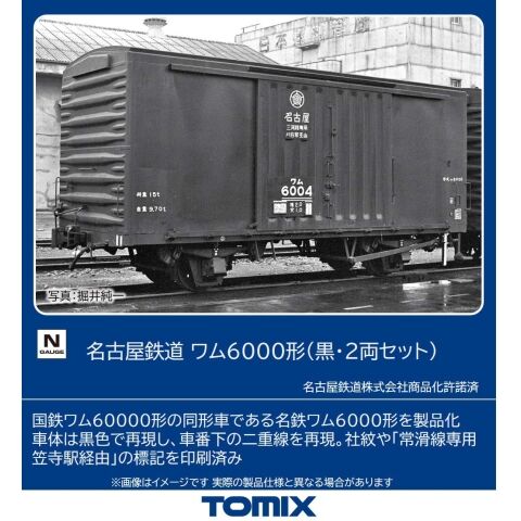 黒色に塗装変更された後のワム6000形を再現 国鉄直通の貨物輸送に使用されていた1984年以前の姿を再現 社紋は側扉に印刷にて表現 社紋・車番・標記類は印刷済み 車番印刷済み「ワム6019・6022」 社紋の下部に「常滑線専用 笠寺駅経由」を印刷済み 国鉄直通承認車を示す車番下の二重線を印刷済み 黒色車輪採用 ミニカーブ通過可能(ミニカーブ通過可能機関車との連結の場合)