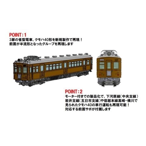 モーター付きでの製品化で、下河原線(中央支線)岩井支線(五日市支線)や信越本線高崎-横川で見られたクモハ40の単行運転も再現可能! 対応する前面サボが付属 DT12形台車を新規製作で再現!