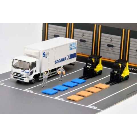 いすゞ フォワード(型式2007~2023) フォークリフト 木パレット4枚 プラパレット4枚 フィギュア 2体(現場作業員) 物流ターミナル背景紙 展示用背景台紙(両面印刷)1枚