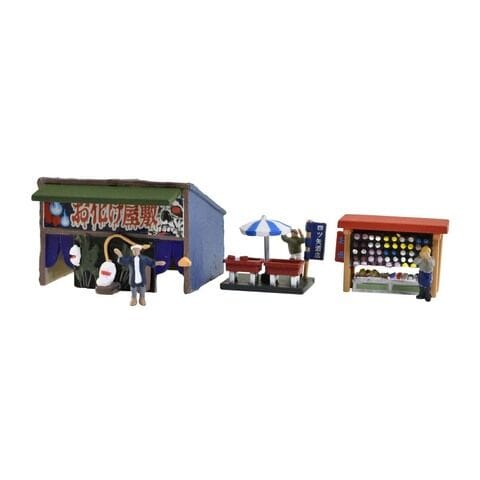 露店×3、人間フィギュア×3、シールのセットです。
