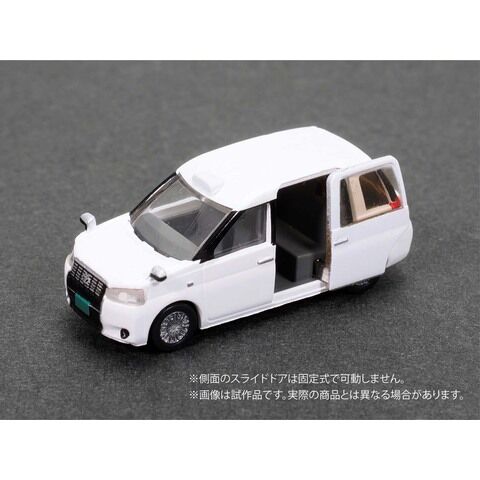 今や街中でもおなじみとなったJPNタクシー、今回のボディカラーはメーカー公式色より初の「白」を設定し、通常の状態を2台&スライドドア開状態を2台の計4台セットで発売します。