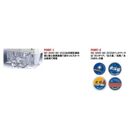 • 付属の印刷済みヘッドマークはHO-2040とHO-2533は「カシオペア・北斗星・北陸・あけぼの」、その他は「カシオペア・北斗星・エルム・あけぼの」付属