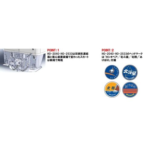 Hゴムは黒色で再現、車輪は一体プレート輪心採用 ヘッドライトは電球色LED点灯、通電端子は屋根上抵抗器カバー内装備 付属の印刷済みヘッドマークはHO-2040とHO-2533は「カシオペア・北斗星・北陸・あけぼの」、その他は「カシオペア・北斗星・エルム・あけぼの」付属 電暖表示灯はHO-2041・HO-2534・HO-2535は取付穴開け済選択取付け、HO-2536は取付け済み、その他は治具穴あけ取付で有無の選択可能 最小半径R600通過可能(S字線形除く) HO-2040のプレステージモデルで金属製手すり・ワイパー・信号炎管・台車ステップ・ホイッスル・エアホース装着済み 付属のナンバープレートはHO-2040と同様になります