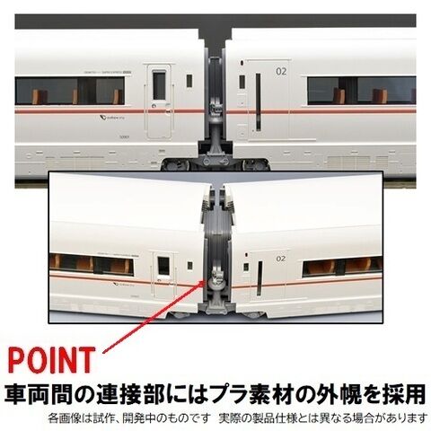 小田急ロマンスカー50000形VSEを再現 車体色はシルキーホワイトに「バーミリオン・ストリーム」と呼ばれるオレンジの帯を再現 車内のシートはオレンジ色で表現 全車室内灯組込み可能 車側表示灯は赤透明パーツで再現し取付済み 側面乗客扉の号車番号は印刷済み 車両の連接部分には通電機構を装備 フライホイール付動力搭載 最小半径R490通過可能(※S字形の線形は除く) 「odakyu」ブランドマークは付属の転写シート対応(基本セットに付属のものを使用) 車番は選択式で転写シート対応(基本セットに付属のものを使用)