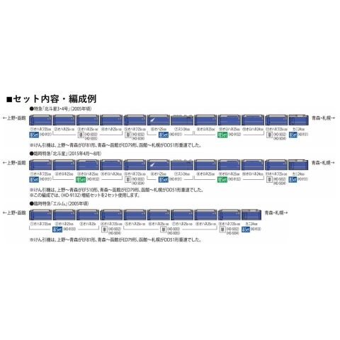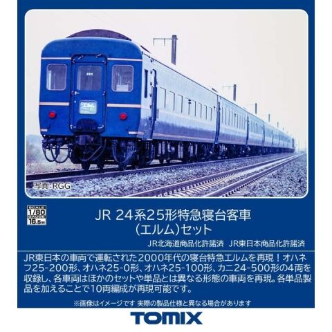 JR東日本の車両で運転された2000年代の寝台特急エルムを再現 トイレタンク表面に貼付して耐寒型形状を再現可能な排出口カバーパーツ付属 妻面の形式自重換算表記など一部表記類印刷済み 靴摺り、ドアレールは印刷済み 車側表示灯工場取付済み 上段寝台用ハシゴを別パーツで再現、ハシゴは開閉選択可能 車番は選択式でメタル転写シート対応(HO-9131・9133・5032・5034に付属) 側面方向幕は付属の内貼り式シールで再現 密自連形TNカプラー標準装備 トレインマーク、側面方向幕は内貼り式シールで再現 最小半径R600通過可能(S字線形を除く) 各単品製品を加えることで10両編成が再現可能 オハネフ25-200形は非常口部が原型に近い形を新規製作で再現 オハネ25-0・100形は非常口部に水切りのある姿を新規製作で再現 カニ24-500形はJRマークの位置が低い508番を再現 Hゴムはカニ24-500形のみ黒色、その他はグレーで再現 AU77形クーラーはオハネ25-0・100形は新型の姿を再現 トレインマーク印刷済みパーツ「エルム」付属 オハネフ25-200形、カニ24-500形のテールライト、トレインマークは基板装備、ON-OFFスイッチ付 オハネフ25-200形、カニ24-500形の車掌室側はケイディー互換タイプ装備